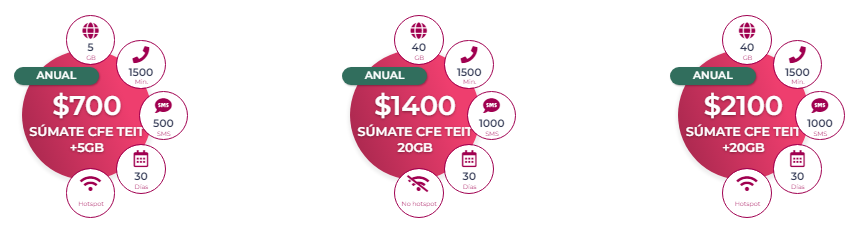 Súmate CFE TEIT +5GB: Este es un servicio de prepago semestral. Cada mes recibirás cinco GB de datos, mil 500 minutos de llamadas y 500 SMS. El costo total es de 400 pesos y funciona como hotspot.