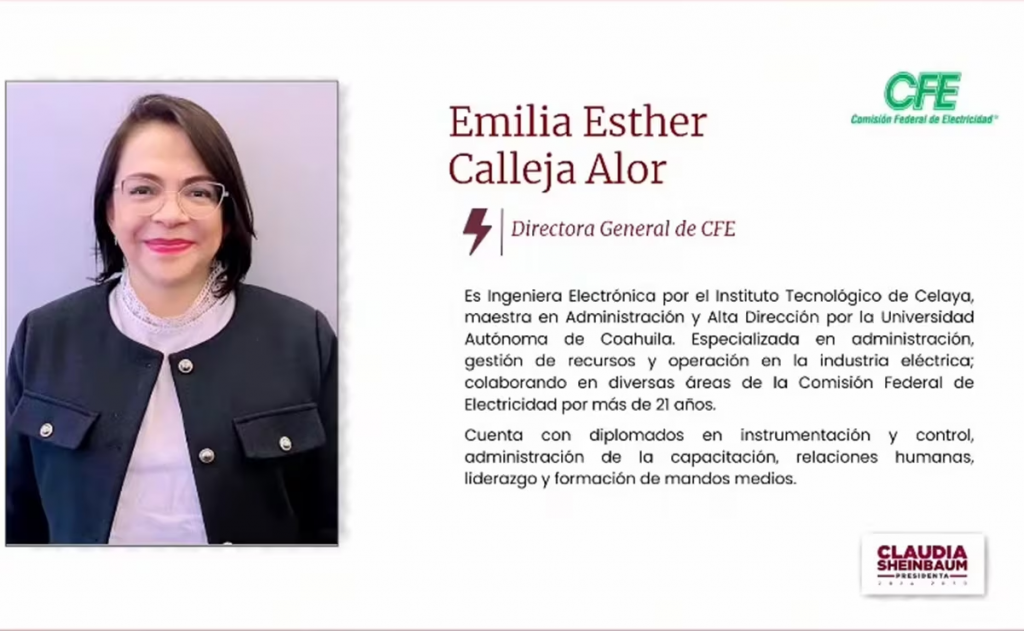 Sheinbaum Pardo resaltó que la próxima titular de la CFE “es una ingeniera que viene de abajo”. Y resaltó que Emilia Esther Calleja “creció en la CFE y conoce profundamente el tema”; además, resaltó su capacidad de liderazgo entre sus compañeros.